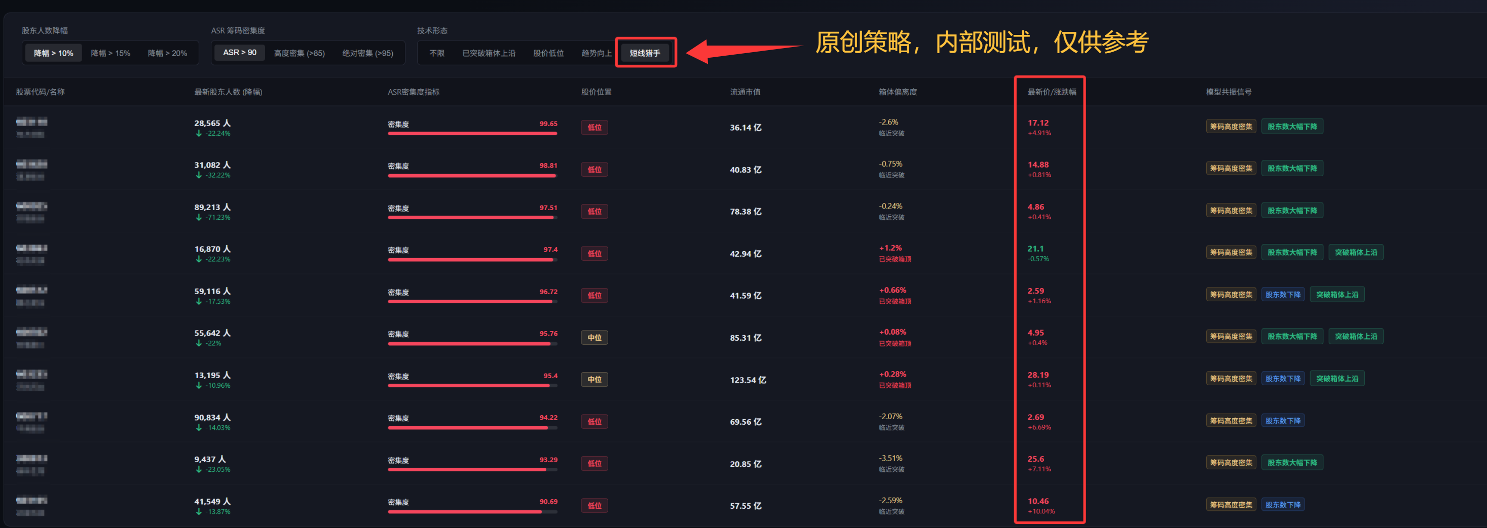 **第二步(精选):** 在股东人数下降的个股池中,筛选出当前股价处于历史相对低位,且ASR指标连续20个交易日大于85的标的。此时确认该股具备“主力在场且成本锁定”的特征。